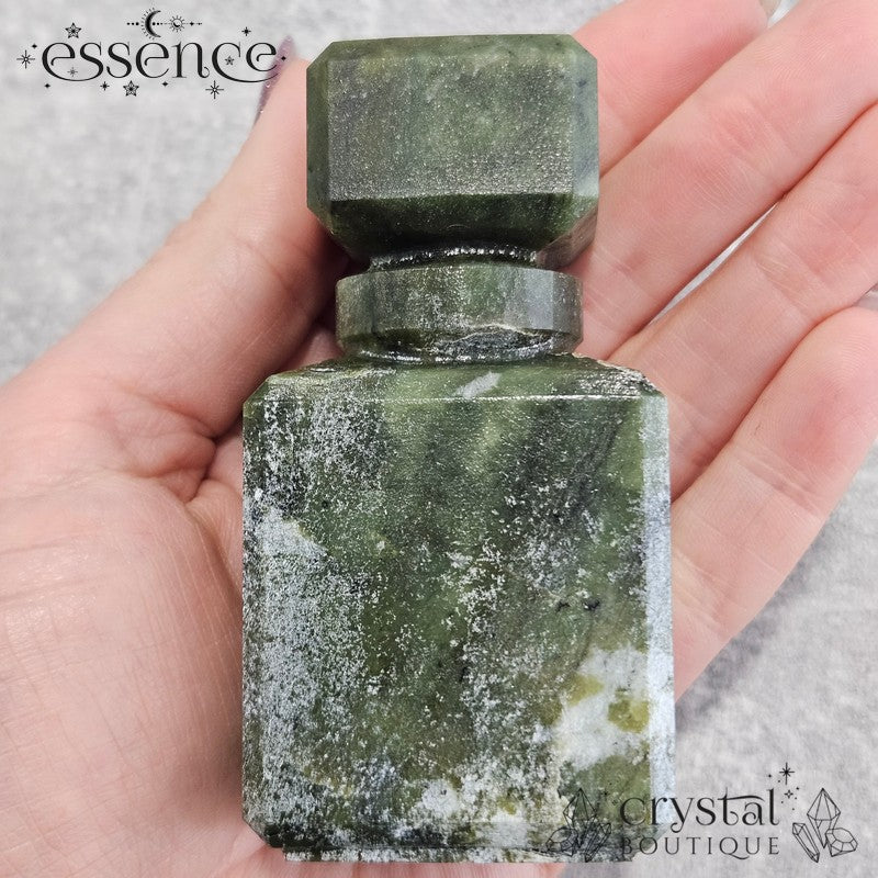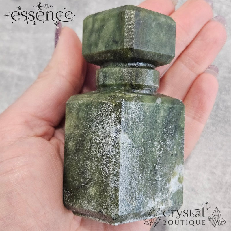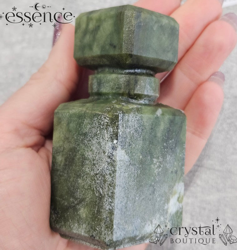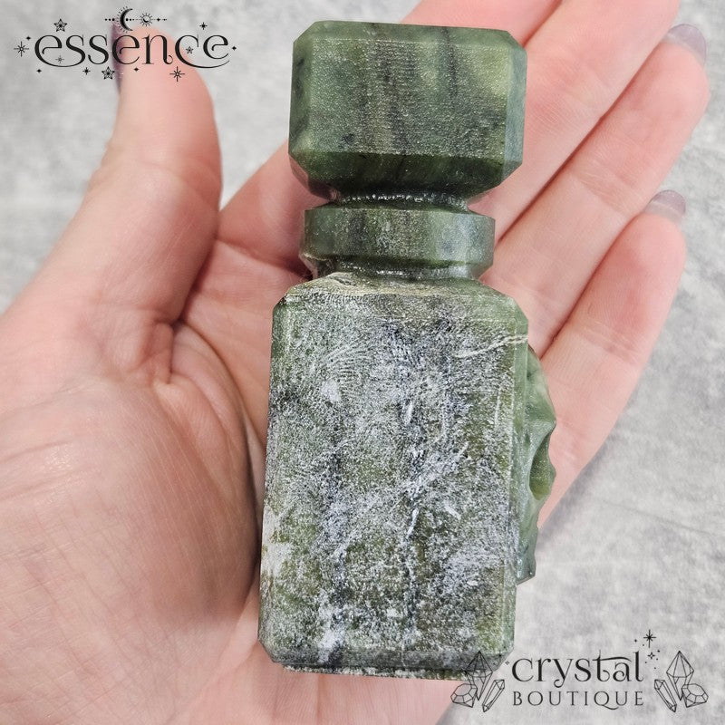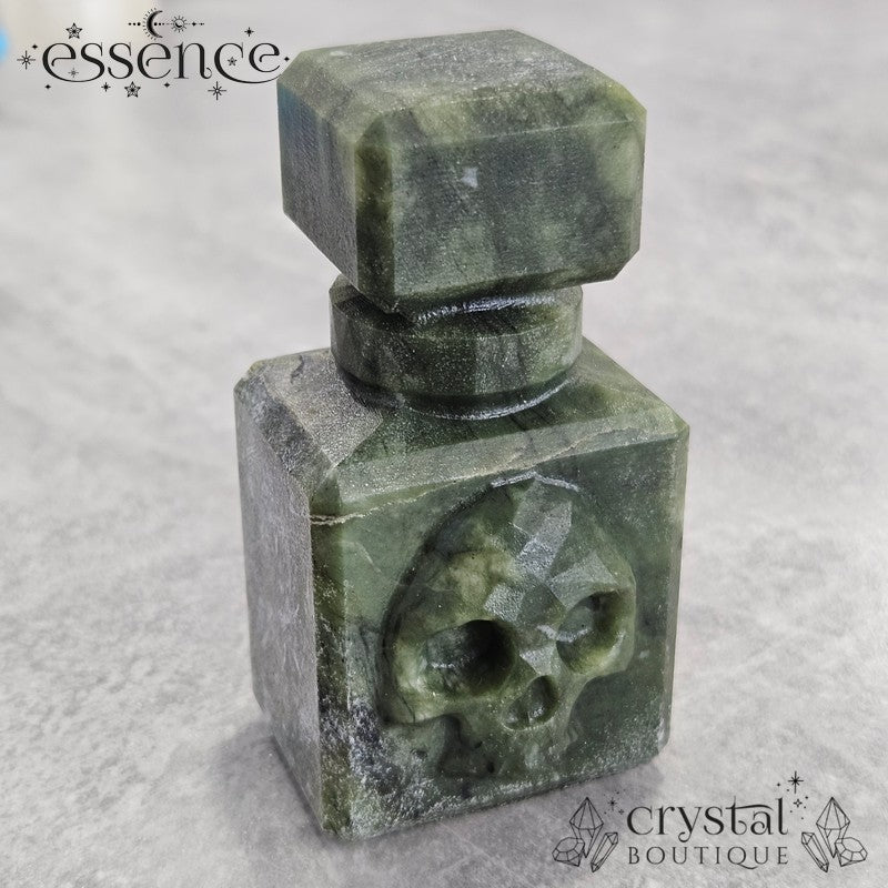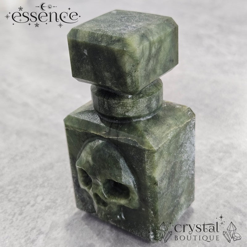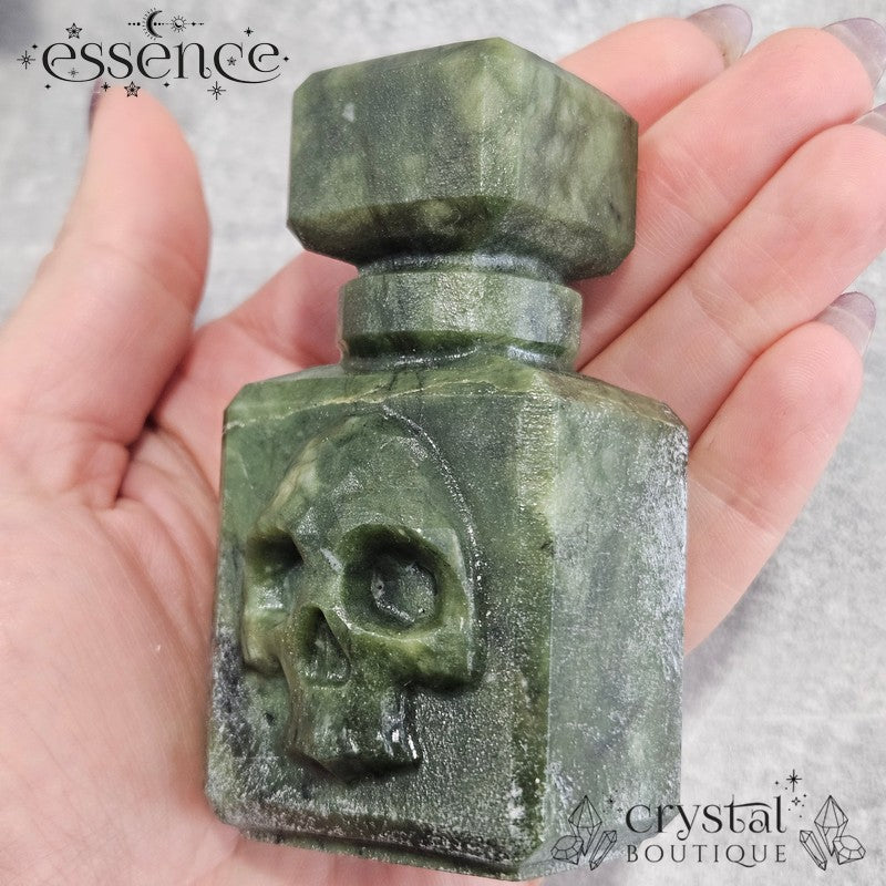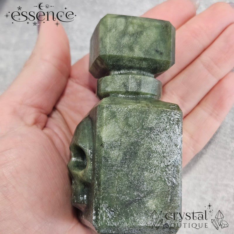 This striking poison bottle carving is made from deep green Serpentine, featuring a bold skull motif etched into the front and a faceted stopper-style top that gives it the look of an ancient alchemist’s vial.