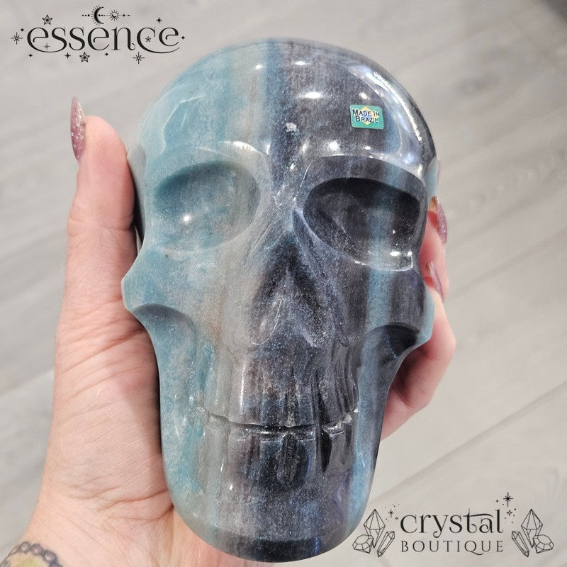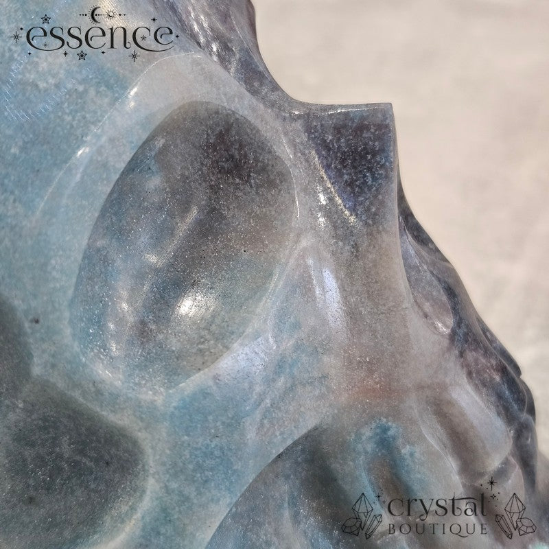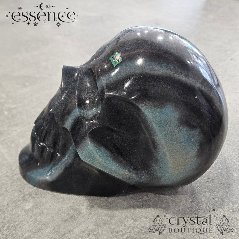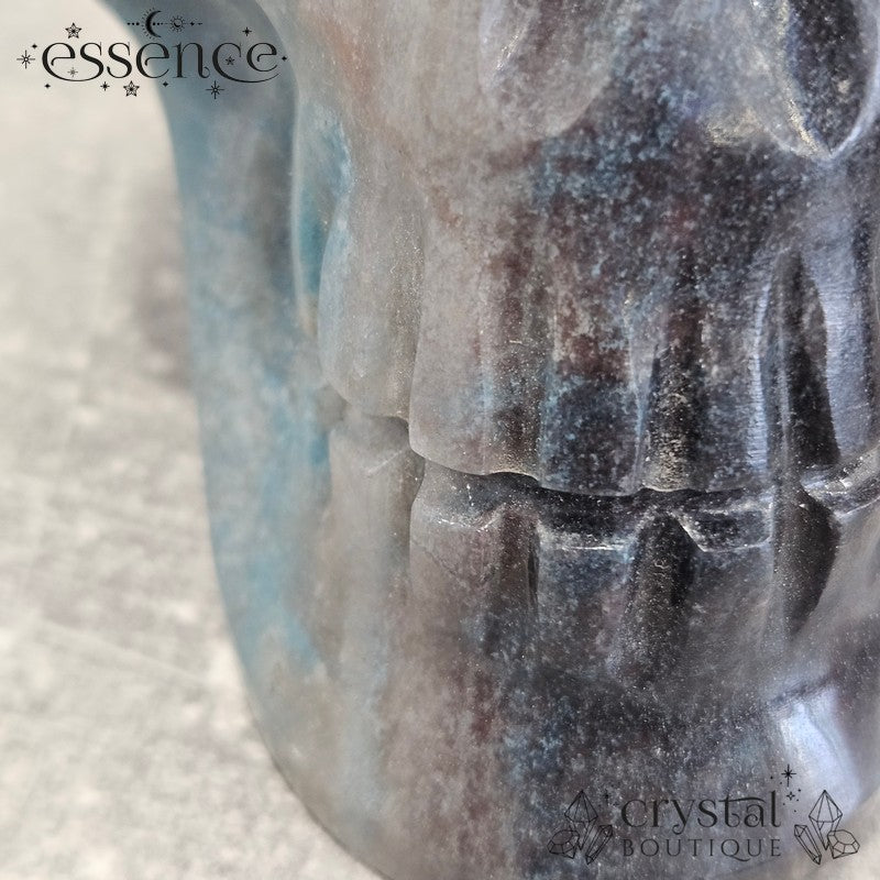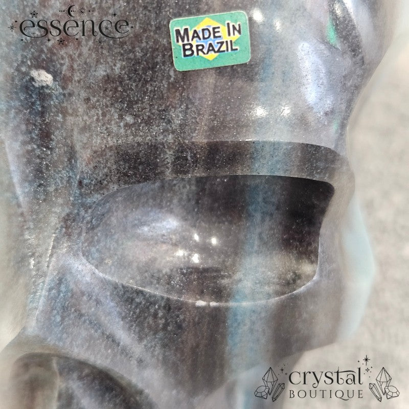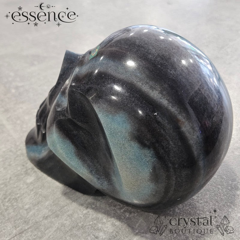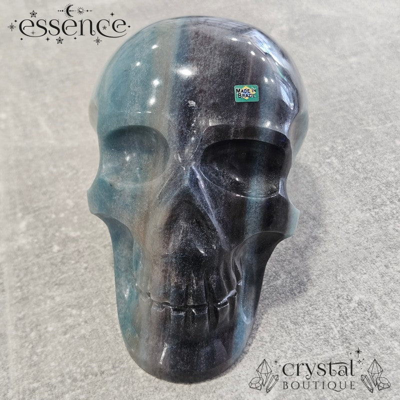 This incredible large crystal skull has been expertly carved by the renowned Brazilian artisan Pitico from a striking piece of natural Trolleite. Its substantial weight of 1,600 g and beautiful hand-polished finish make it a true collector’s piece, with vibrant swirls of blue, teal, and smoky charcoal flowing seamlessly across the form.