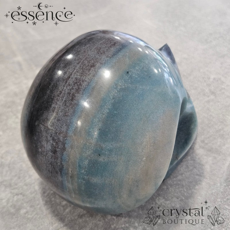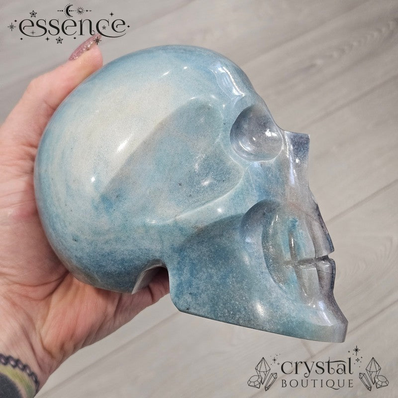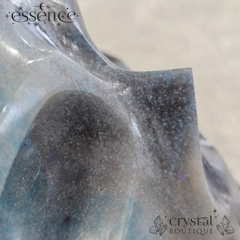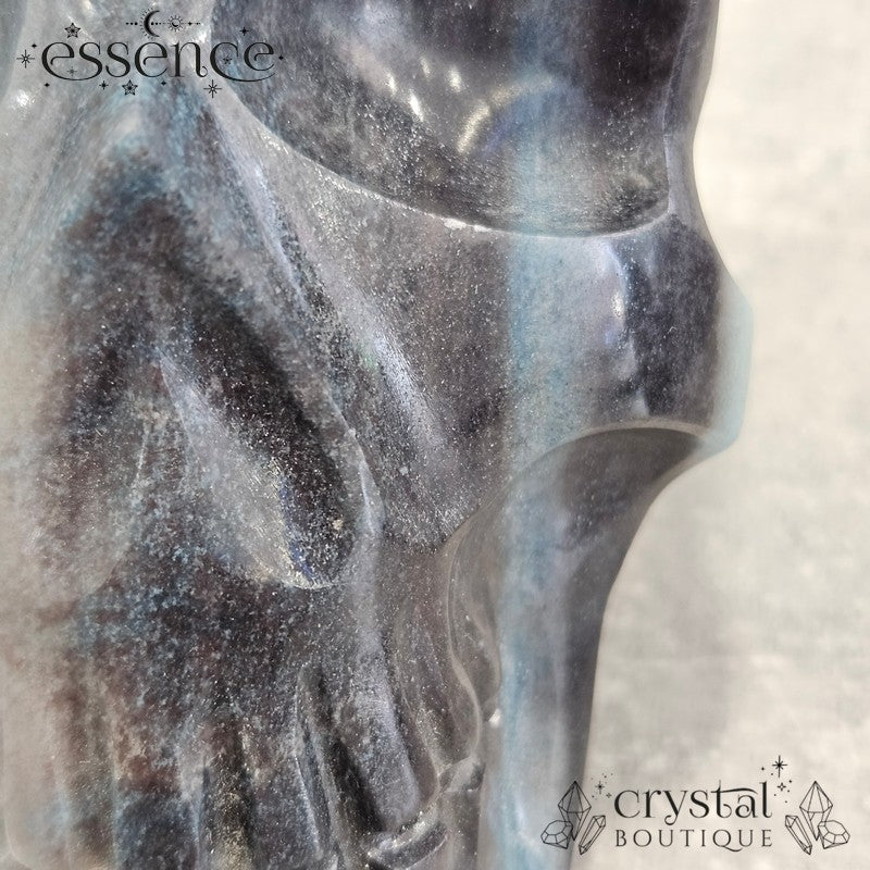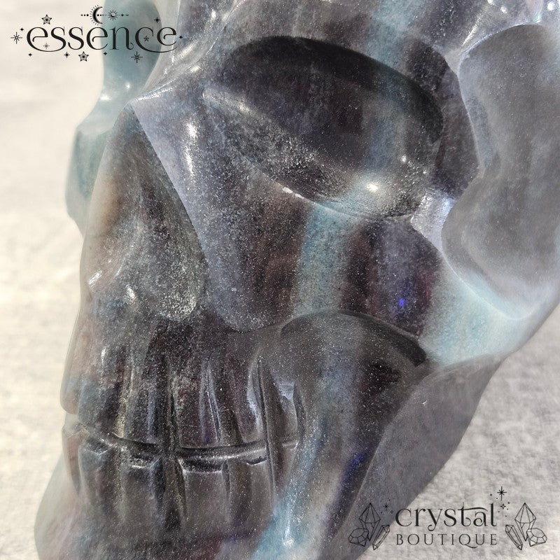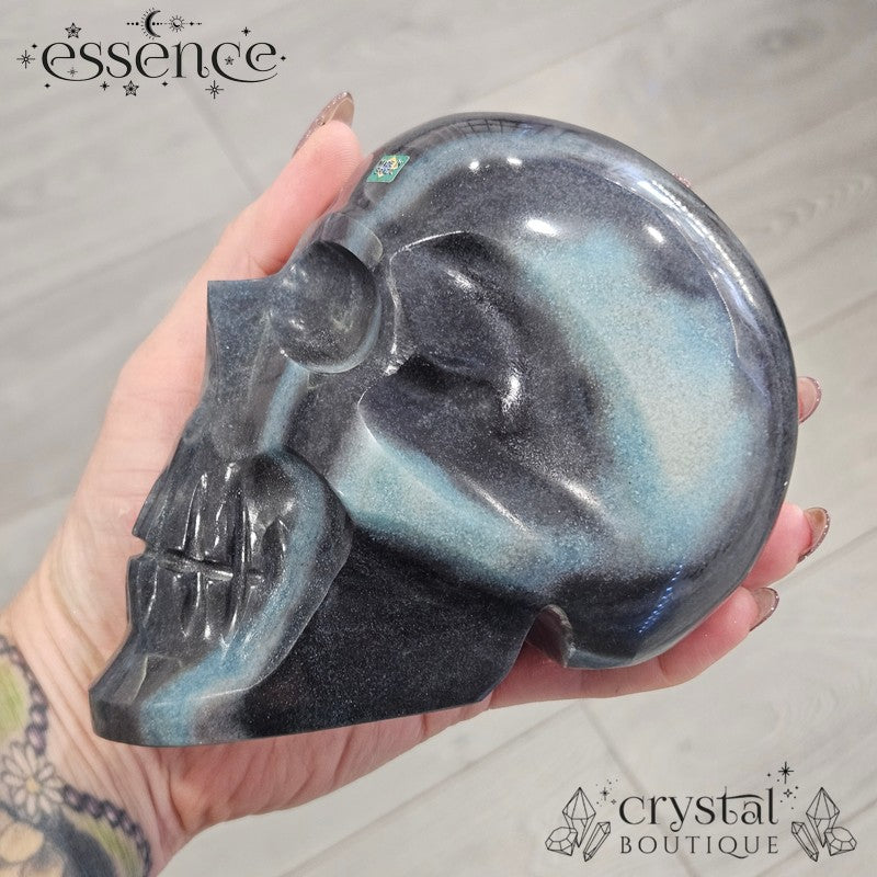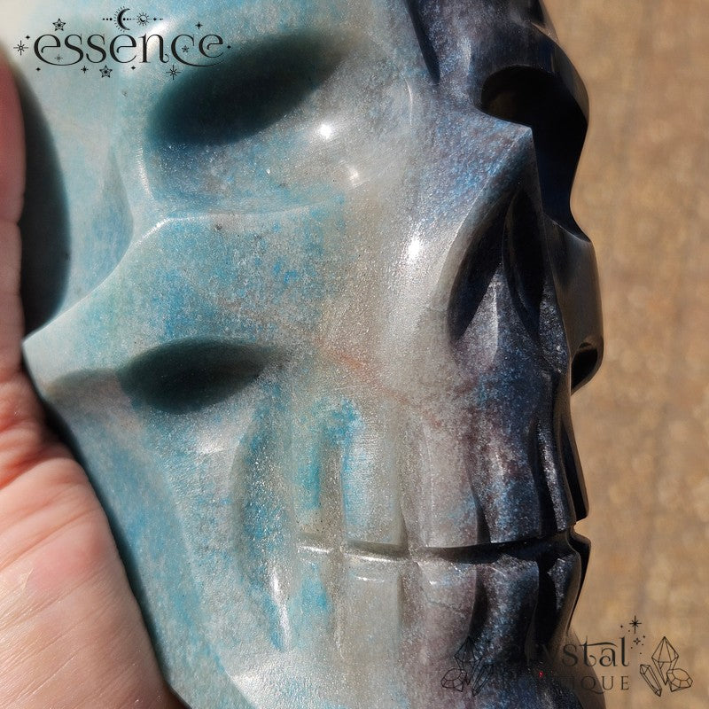 This incredible large crystal skull has been expertly carved by the renowned Brazilian artisan Pitico from a striking piece of natural Trolleite. Its substantial weight of 1,600 g and beautiful hand-polished finish make it a true collector’s piece, with vibrant swirls of blue, teal, and smoky charcoal flowing seamlessly across the form.