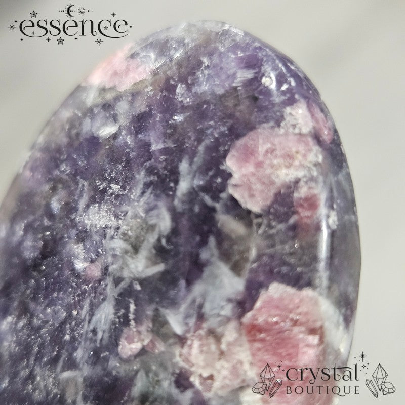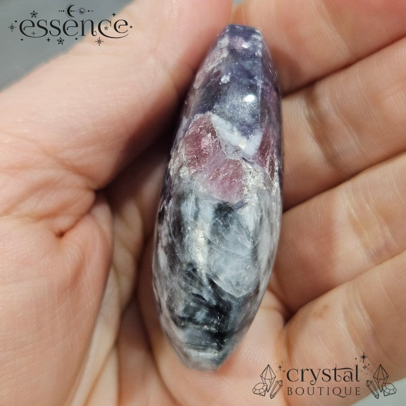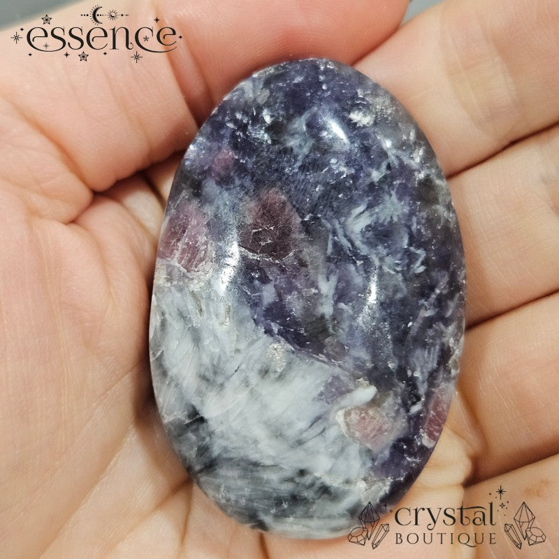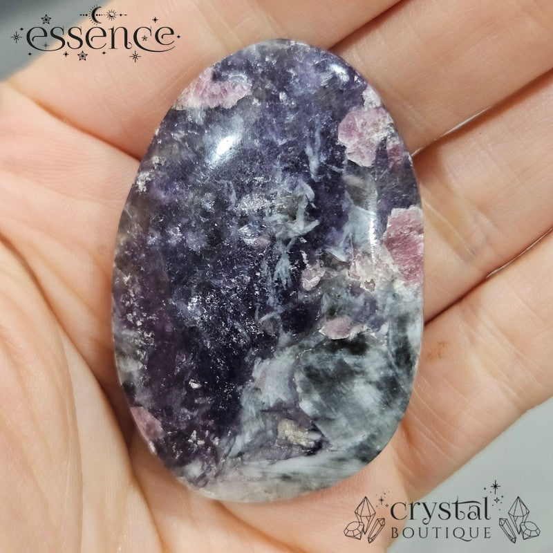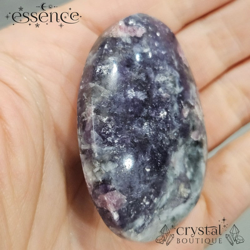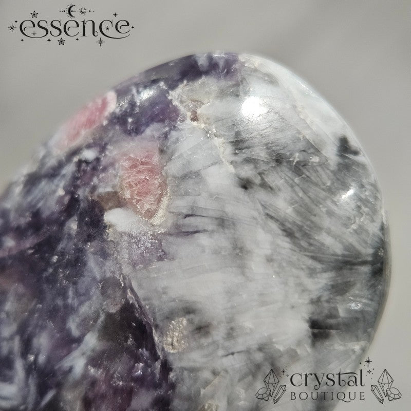 With its soft lilacs, dusky pinks, moody greys, and sparkling white layers, every palm stone looks like a cosmic swirl frozen in time. Each mineral brings something special to the mix – Lepidolite's lithium-rich calming vibes, Pink Tourmaline’s gentle heart energy, Smoky Quartz's grounding hug, and Cleavelandite’s airy, high-vibe clarity.