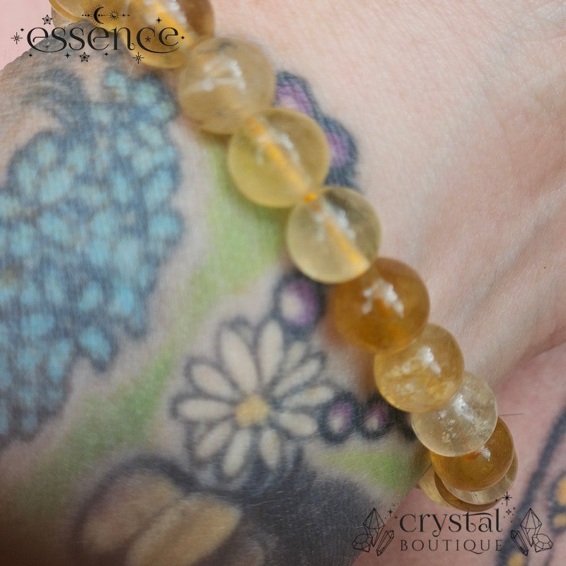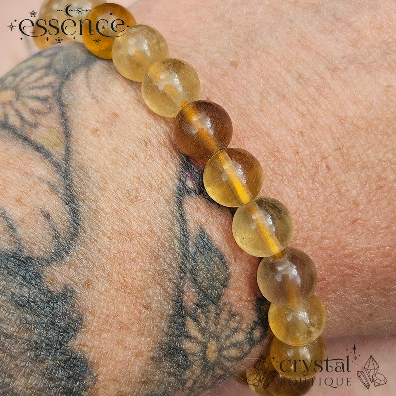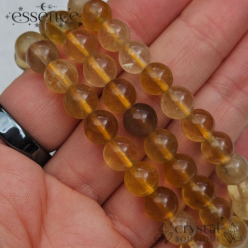 Each bead glows with honeyed warmth—from soft amber and citrusy gold to deep caramel tones. The beads are smooth and glassy, catching the light like drops of liquid sunlight. This bracelet has a cheerful, empowering energy—like golden hour for your soul.