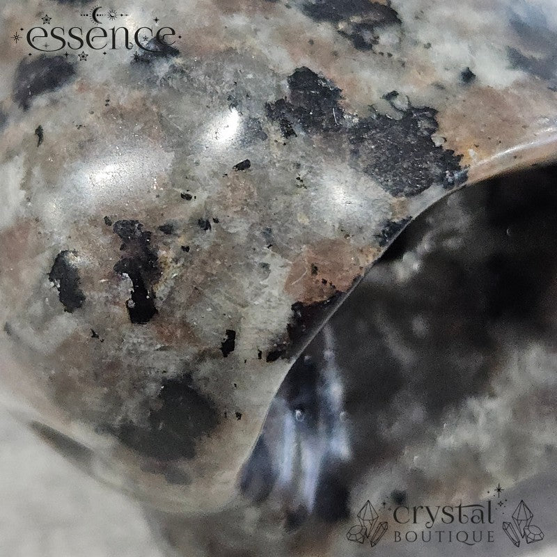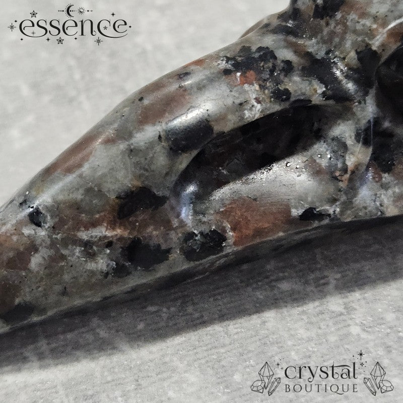 This incredible raven skull is carved from Yooperlite — a seemingly ordinary grey stone that comes to life under UV light with fiery orange fluorescence. 🌋🔦 Formed from syenite rock rich in fluorescent sodalite, Yooperlite is a volcanic stone born from ancient geological activity.
